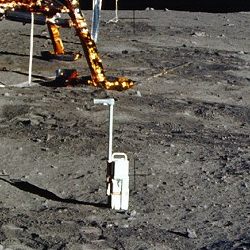 アポロ11号の着陸船と、そのそばで観測装置をセットしているバズ・オルドリン宇宙飛行士(左)。手前に置かれた観測装置に重なっている十字の線が消えている(右)。 |